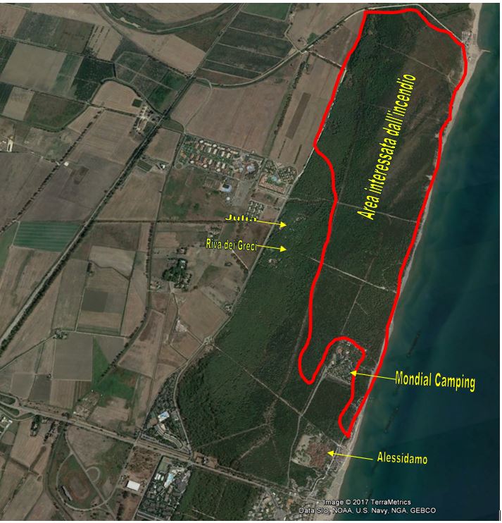 L'abbiamo pensato più volte in questi 6 anni,ogni volta che si attraversava quel tratto. Purtroppo sono passati solo tre giorni ed eccoci qua a raccontare un disastro, in assoluto il più grave incendio che abbia interessato la nostra pineta, la superficie interessata dal fuoco è stata di circa 150 ha, Nella pineta bruciata alle 20:30 regna un silenzio assordante, rotto solo dalla sirene dei pompieri, dal Canadair e dalla "grida" di sofferenza degli animali, cinghiali, volpi e uccelli, roba da far accapponare la pelle.