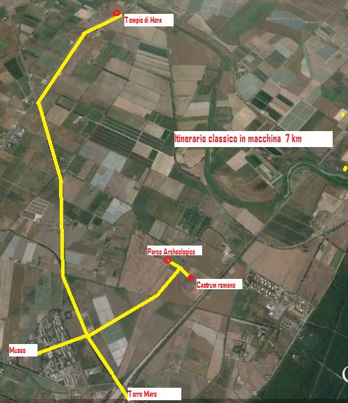 Questo itinerario,da percorrere in bici o con mezzi motorizzati, è quello che tocca le aree archeologiche più note, partendo dal Tempio di Hera, quindi la Necropoli Crucinia, Il Museo Archelogico,il Parco Archeologico , il Castro Romano ed il Castello di Torre Mare.
