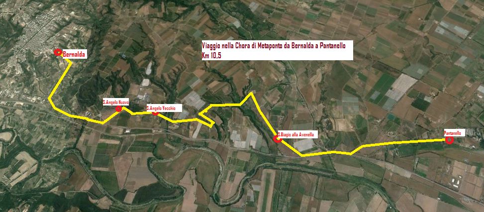 L'itinerario attraversa tutta la Chora ,dal centro urbano di Bernalda fino al santuraio di Pantanello lungo la valle del Basento. Un percorso suggestivo in quanto attraverso proprio le tre contrade più sfruttate dal punto di vista agricolo dai coloni greci ,ossia quella di Sant'Angelo, Avinella e Pizzica. Il percorso ovviamente può essere fatto in entrambe le dizioni a secondo se si vuole come tappa finale raggiungere il centro urbano di Bernalda o la SS106. Partendo da Bernalda, si scende nella ripida discesa della Lama e si risale vero Sant'Angelo, dove troviamo il sito dell'antica fattoria magno greca denominata Sant'Angelo Nuovo , quindi dopo poco , le fondamenta dei resti di altra fattoria magno-greca , quella di Sant'Angelo Vecchio, dopo un tratto di sterrato e saliscendi si arriva a S.Biagio alla Avinella e quindi se si ha ancora birra nella gambe fino a Pantanello.