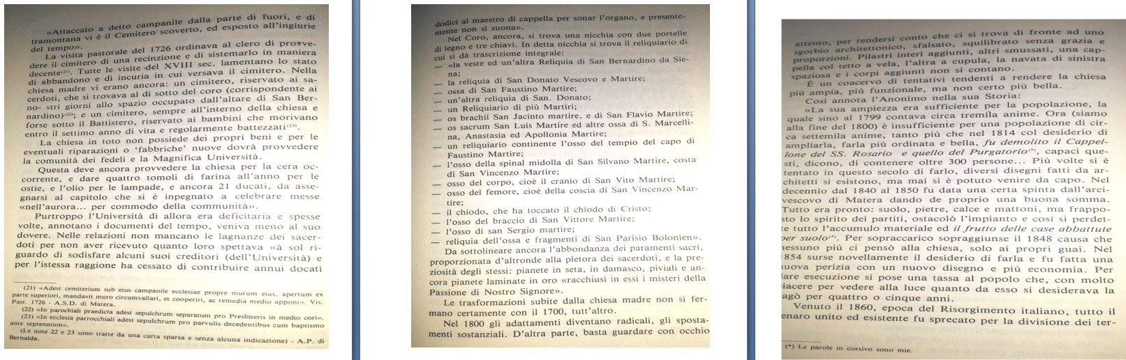 La popolazione di Bernalda, cresceva rapidamente nel XVI-XVII secolo per cui la sola navata centrale non bastava per le esigenze dei fedeli, quindi nei secoli la chiesa ha subito varie trasformazioni in ampliamento,ma nei tentativi di renderla più capiente si è realizzata una struttura architettonica poco armonica se non proprio brutta, con pilastri e archi diversi, tetti in parte a vela e in parte in legno. Lateralmente a sinistra erano presenti due cappelloni, di cui uno è ancora presente mentre l'altro fu demolito. Tanti tentativi per renderla più capiente ,ma l'hanno resa meno bella da punta di vista architettonico. Nel 1848 ,la polpolazione di Bernalda sfiorava le 7000 anime, e ci si rese conto che, nonostante le varie proposte di modifica, occorreva costruirne un'altra di chiesa più ampia, Furono raccolti fondi dai fedeli per una nuova costruzione, il centro storico ormai pieno di abitazione non aveva spazi per una nuova chiesa, allora si scelse un sito fuori le mura, in prossimità del convento di San Francesco, ormai abbandonato, dove sorge oggi l'acquedotto. Con l'unità d'Italia nel 1860 i fondi raccolti furono utilizzati per le milizie e la divisione delle terre e non furono più sufficienti per la realizzazione di una chiesa ex-novo. La nuova chiesa non fu più realizzata.