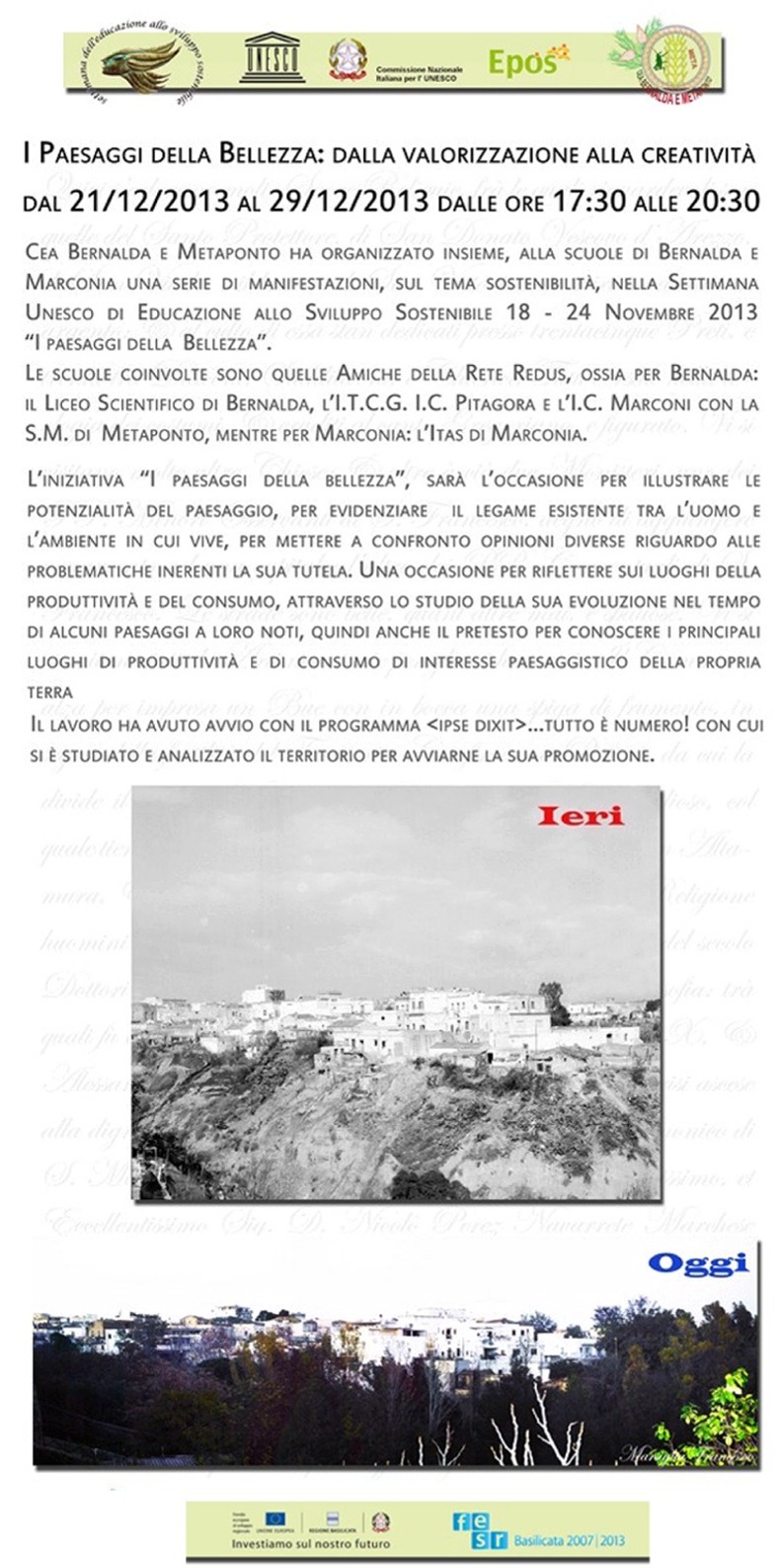 Cea Bernalda e Metaponto ha organizzato insieme alla scuole di Bernalda ,Metaponto e Marconia una serie di manifestazioni,sul tema della sostenibilità,nella Settimana Unesco di Educazione allo Sviluppo Sostenibile, dal 18 al 24 Novembre 2013 dal titolo “I paesaggi della bellezza”.