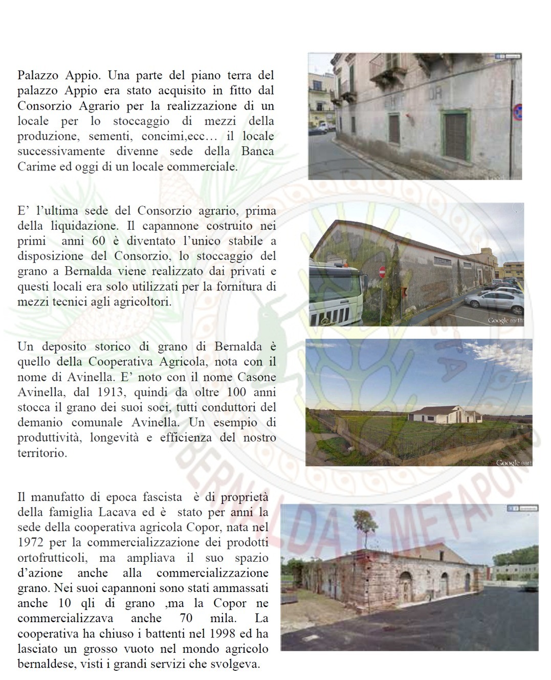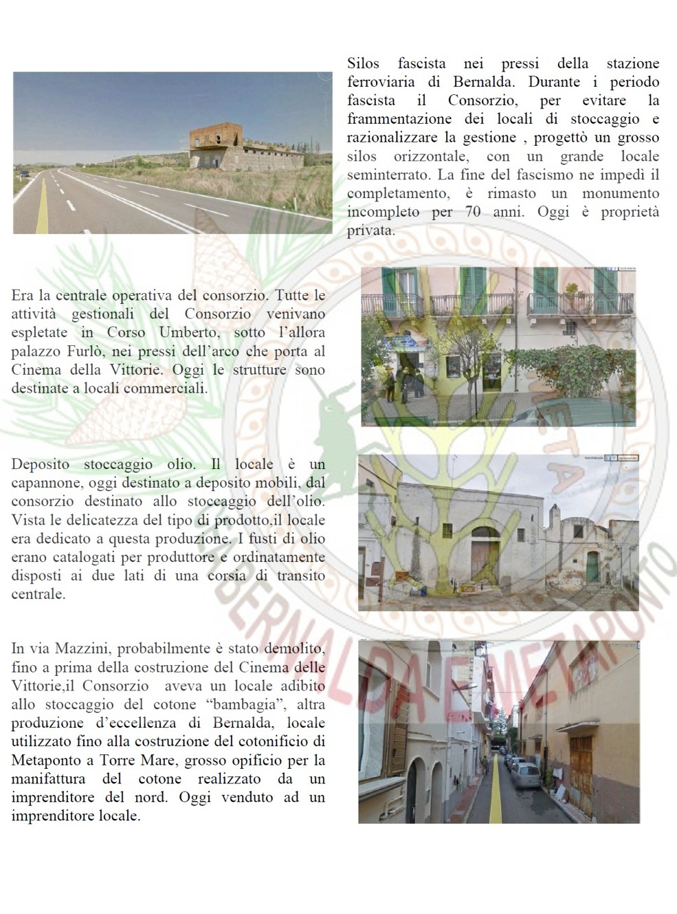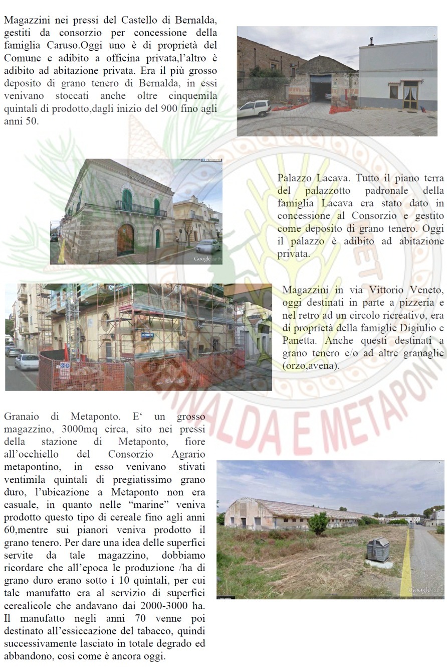 Il Consorzio Agrario è stato il cuore pulsante a supporto di una economia basata quasi esclusivamente sull’agricoltura. Il Consorzio a Bernalda, ha visto come primo gestore B.Furlò, a cui seguì G.Verga, A.Caputi, fino alla liquidazione dell’Ente nei primi anni duemila.